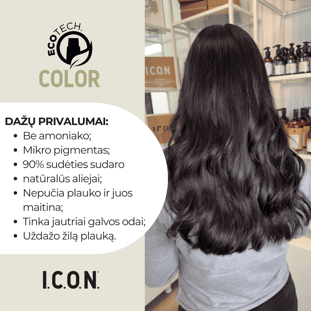 I.C.O.N. Ecotech – tai aliejinio pagrindo plaukų dažai, sukurti siekiant ne tik suteikti plaukams ilgalaikę, sodrią spalvą, bet ir užtikrinti jų gilų maitinimą bei apsaugą. Sudėtyje esantys ekologiški ir natūralūs ingredientai švelniai veikia plaukus ir galvos odą, išlaikydami plaukų sveikatą ir žvilgesį net po dažymo proceso. Dėl pažangios formulės Ecotech aliejiniai plaukų dažai užtikrina tolygų žilų plaukų padengimą ir suteikia natūraliai atrodančią, spindinčią spalvą. Kreminė, aliejinė tekstūra leidžia dažams tolygiai pasiskirstyti, suteikdama komfortą tiek meistrui, tiek klientui. Ecotech technologija sujungia ekologiją ir inovacijas, siekdama pamaitinti plaukus, išsaugoti jų natūralų blizgesį, švelnumą ir elastingumą. Net po dažymo jūsų plaukai išliks sveiki, minkšti ir gyvybingi.Pagrindiniai privalumai: