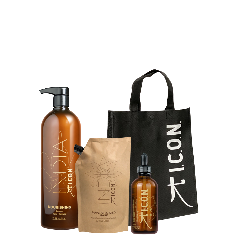 | Kas įeina į rinkinį: | I.C.O.N. India Nourishing šampūnas 250 ml Turtingos, drėkinančios formulės šampūnas su moringos ir argano aliejais švelniai prižiūri plaukus, atkurdamas jų minkštumą ir elastingumą. Antioksidantų kompleksas apsaugo nuo laisvųjų radikalų, o plaukai tampa švelnūs, žvilgantys ir glotnūs. I.C.O.N. India Supercharged kaukė 250 ml Intensyviai maitinanti ir atkurianti kaukė, praturtinta peptidais, moringos bei argano aliejais. Ji giliai atkuria pažeistą plauko struktūrą, sustiprina vidinę jo sandarą ir suteikia ypatingo švelnumo bei lankstumo. Idealiai tinka sausiems, pažeistiems ar chemiškai paveiktiems plaukams. I.C.O.N. India Oil maitinamasis aliejus 112 ml Lengvos tekstūros aliejus su moringos, argano ir ambros ekstraktais, kuris greitai įsigeria, neapsunkindamas plaukų. Suteikia šilkinio glotnumo, žvilgesio ir apsaugo nuo karščio bei išorinių veiksnių. |