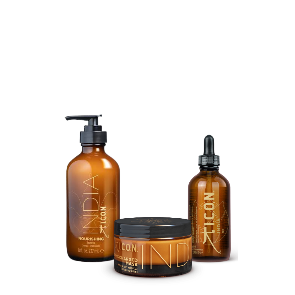 | Kas įeina į rinkinį: | I.C.O.N. India Nourishing šampūnas 250 ml Turtingos, drėkinančios formulės šampūnas su moringos ir argano aliejais švelniai prižiūri plaukus, atkurdamas jų minkštumą ir elastingumą. Antioksidantų kompleksas apsaugo nuo laisvųjų radikalų, o plaukai tampa švelnūs, žvilgantys ir glotnūs. I.C.O.N. India Supercharged kaukė 250 ml Intensyviai maitinanti ir atkurianti kaukė, praturtinta peptidais, moringos bei argano aliejais. Ji giliai atkuria pažeistą plauko struktūrą, sustiprina vidinę jo sandarą ir suteikia ypatingo švelnumo bei lankstumo. Idealiai tinka sausiems, pažeistiems ar chemiškai paveiktiems plaukams. I.C.O.N. India Oil maitinamasis aliejus 112 ml Lengvos tekstūros aliejus su moringos, argano ir ambros ekstraktais, kuris greitai įsigeria, neapsunkindamas plaukų. Suteikia šilkinio glotnumo, žvilgesio ir apsaugo nuo karščio bei išorinių veiksnių. |