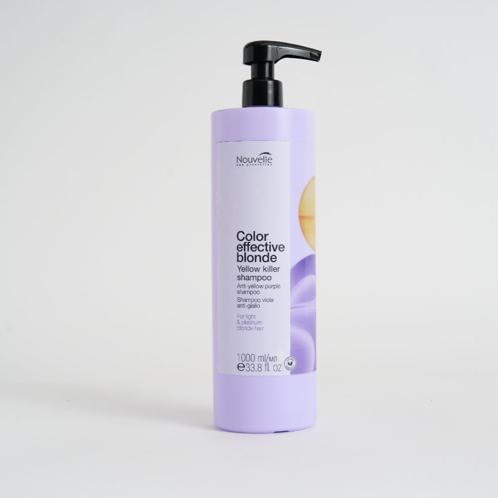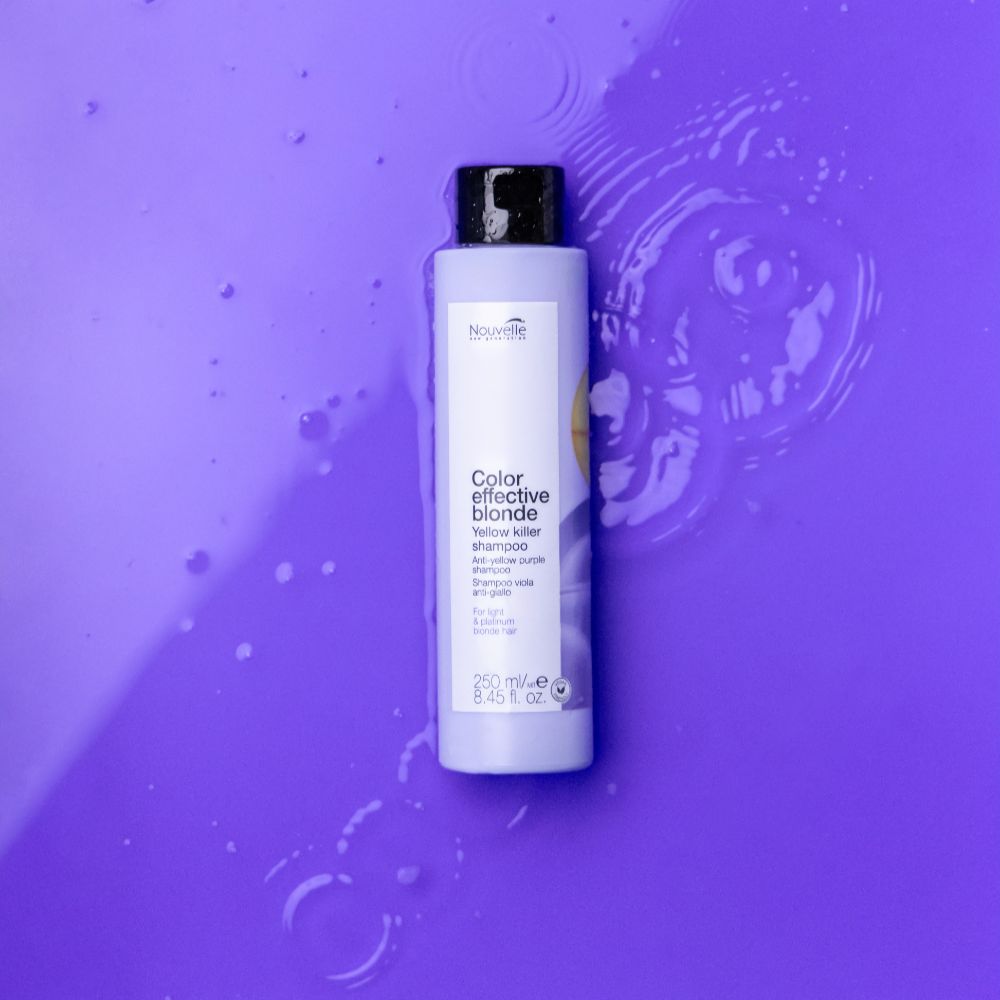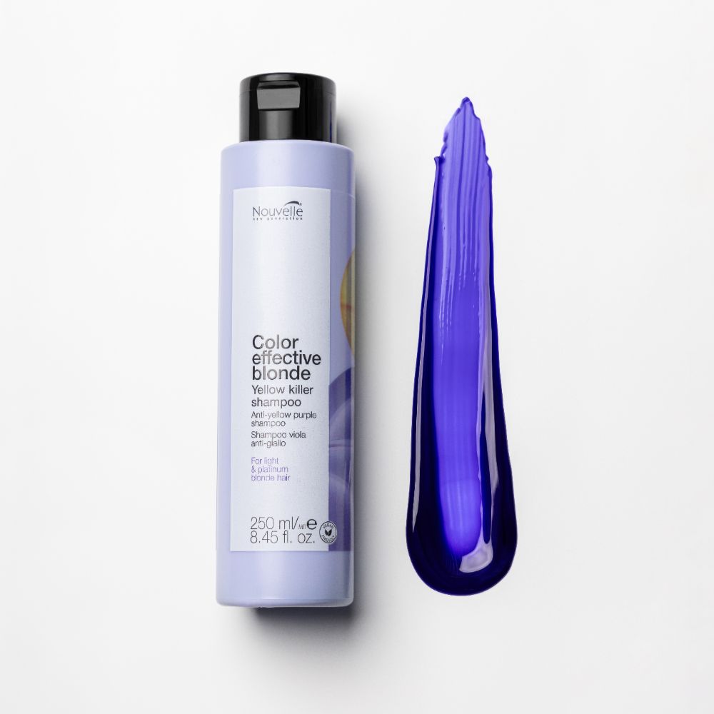 „Nouvelle Yellow Killer“ – tai profesionalus violetinis šampūnas nuo geltonumo be sulfatų, sukurtas tam, kad efektyviai neutralizuotų nepageidaujamą geltonumą ir sugrąžintų šviesiems plaukams prabangų šaltą atspalvį.